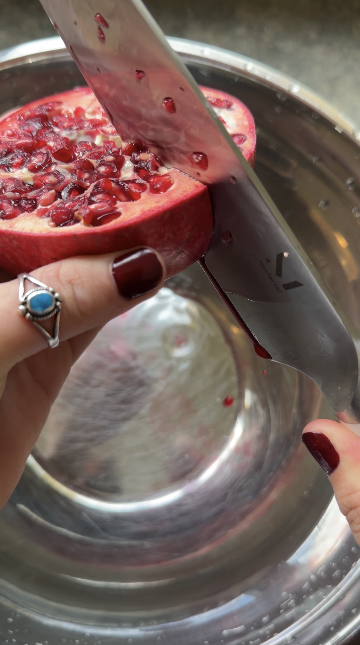 Essentially- all you need is a large bowl- filled about halfway through with water, and a knife. First cut the pomegranate in half, and then score each half into 4 sections. You want to have 4 parts of the pomegranate that you can bend backward to pick out the seeds. So when scoring your pomegranate, don’t completely cut through the middle. See image above for an example.