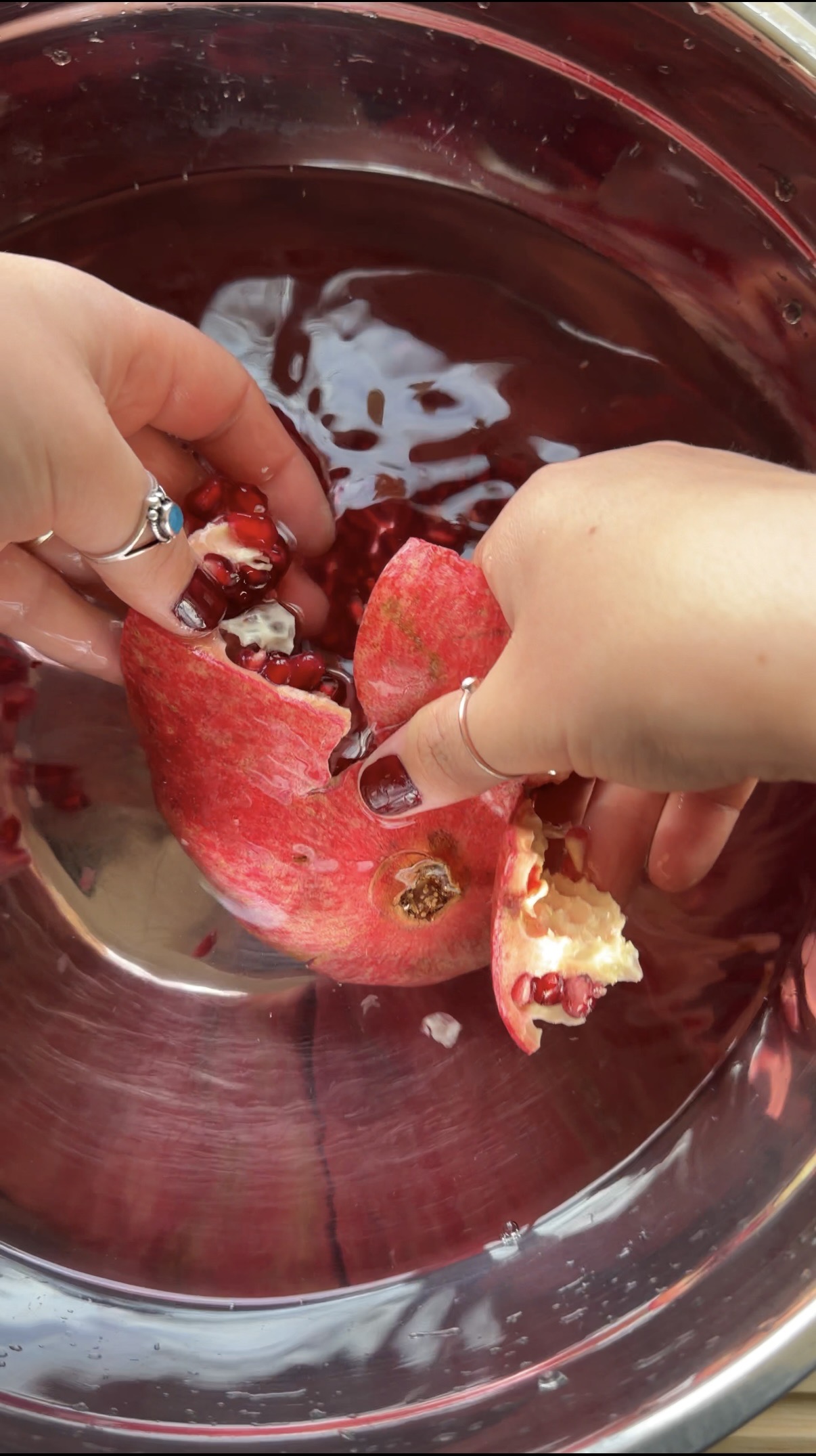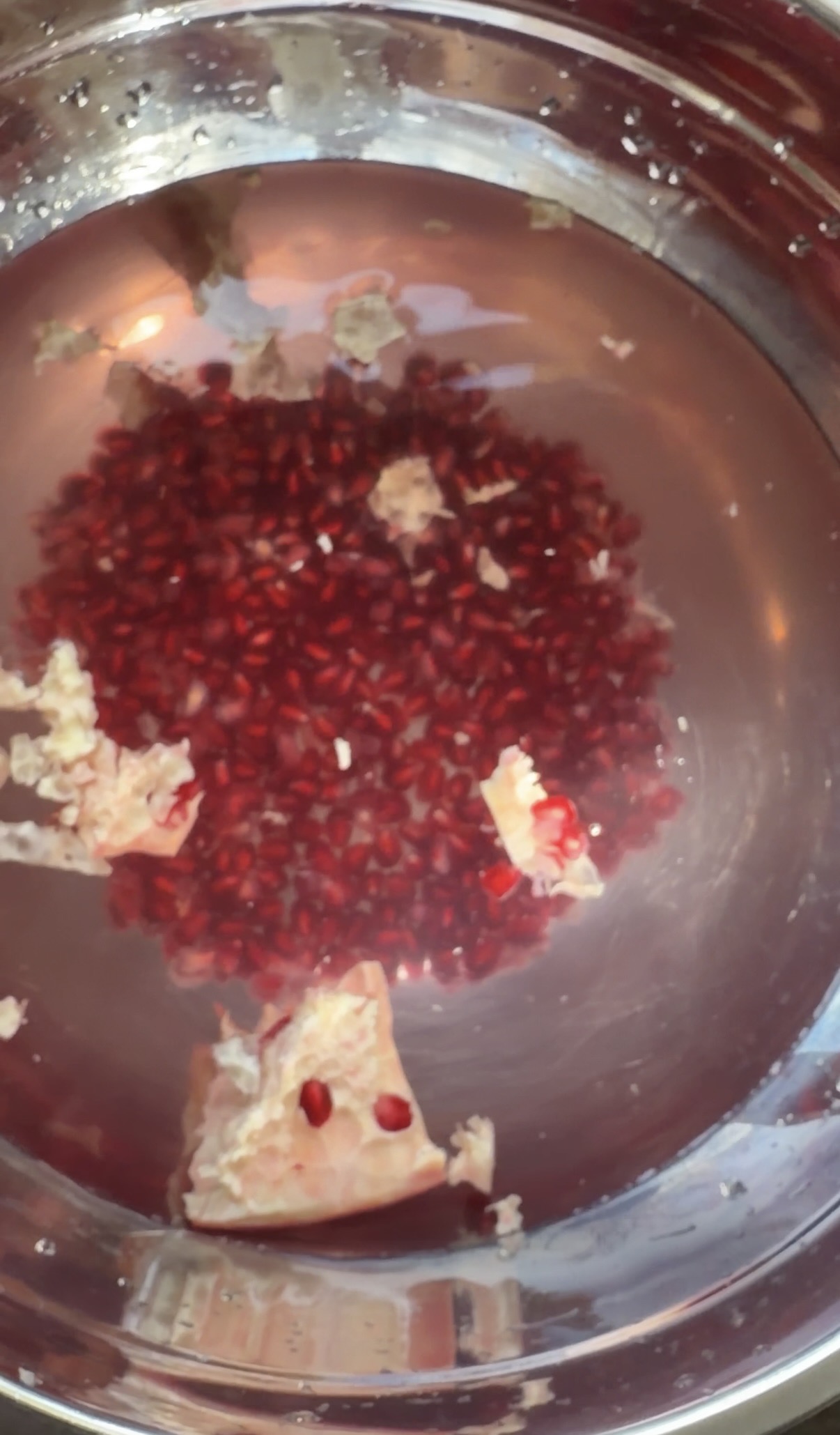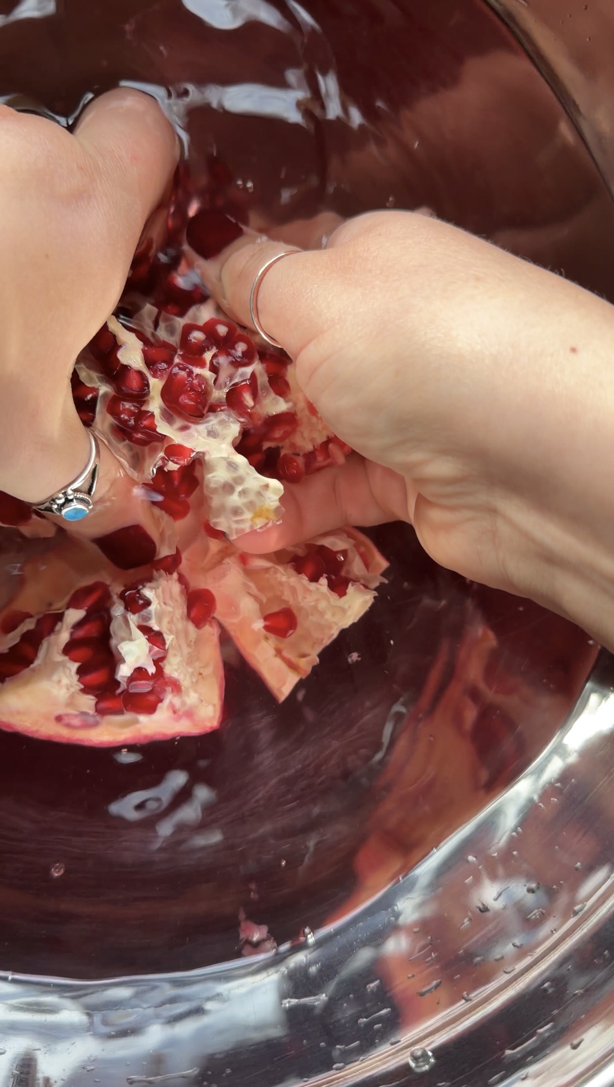 Next (and for best results), place your half of the pomegranate into the water with the seeds facing down and the skin facing up. Using your hand, carefully pull apart the pomegranate seeds, off of the flesh and into the water. You can turn the pomegranate over to see what you’re doing, but try to keep it under the water to prevent juice spraying everywhere. The white pith of the pomegranate will float to the top which you can discard (either by scooping it out with your hand or using a metal loose leaf tea strainer), and then scoop the seeds out of the water, pat dry with a paper towel, and store in an air tight container in the fridge for up to 5 days.