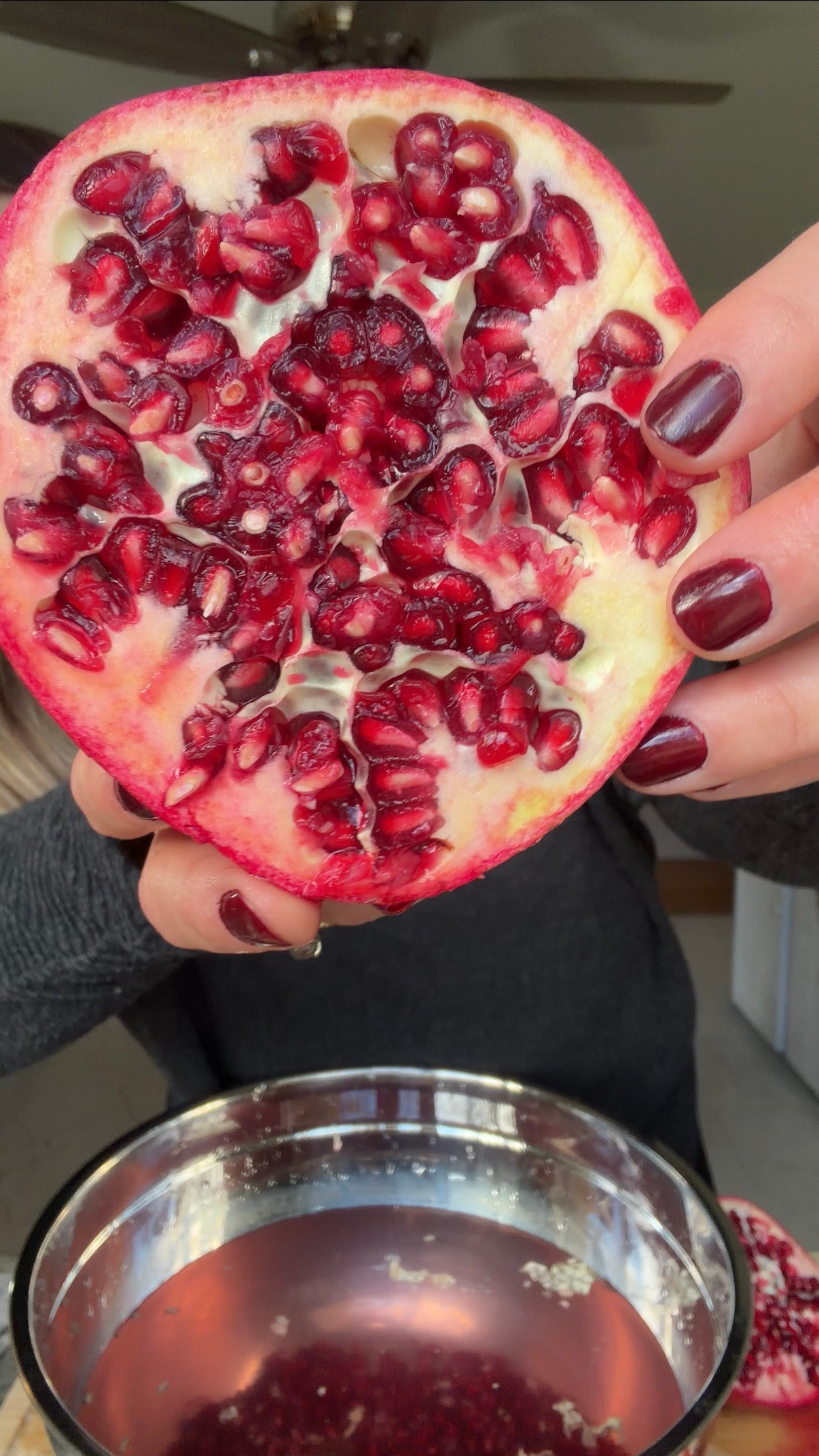 In case you’re like me and enjoy eating a fresh pomegranate without ruining your shirt, then this post is for you! I recently stumbled upon Glow With Ella’s Instagram post on how to do this and have been using the “Water Method” ever since. I feel like it’s a kitchen secret or something (because I’m 31 years old and just learned it) but I’m here to break the silence because we do not gatekeep in the wellness world! So here it is- if you want some yummy pomegranate seeds without all the red juice splattered everywhere, my instructions are below. I also loveee talking about the health benefits of what we consume, so listed at the very bottom of this post are five pomegranate health benefits!
