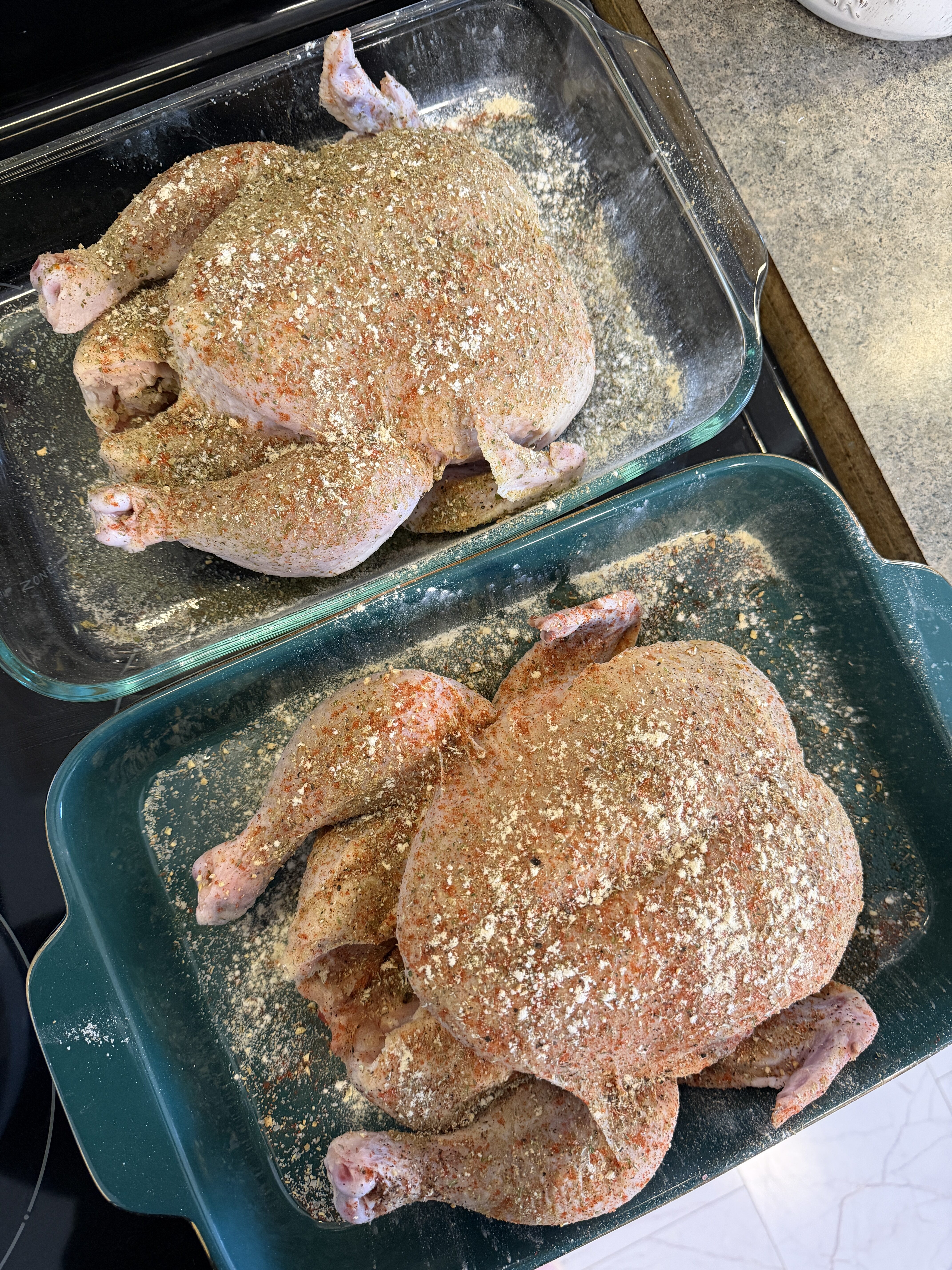 Okay first things first- here are my chickens, and yes I made two because one wasn’t enough! I’m going to link my roasted chicken recipe here for you to try! Every single time I make this chicken, the skin comes out lightly brown and crunchy, the inside is moist, and the drippings are BANGIN! You can’t go wrong- truly any herb you like will do. I did a bunch of marjoram, thyme, parsley, sage, citrus salt, salt, pepper, onion/garlic powder, and paprika! Here’s the link to my Roasted Chicken Recipe: