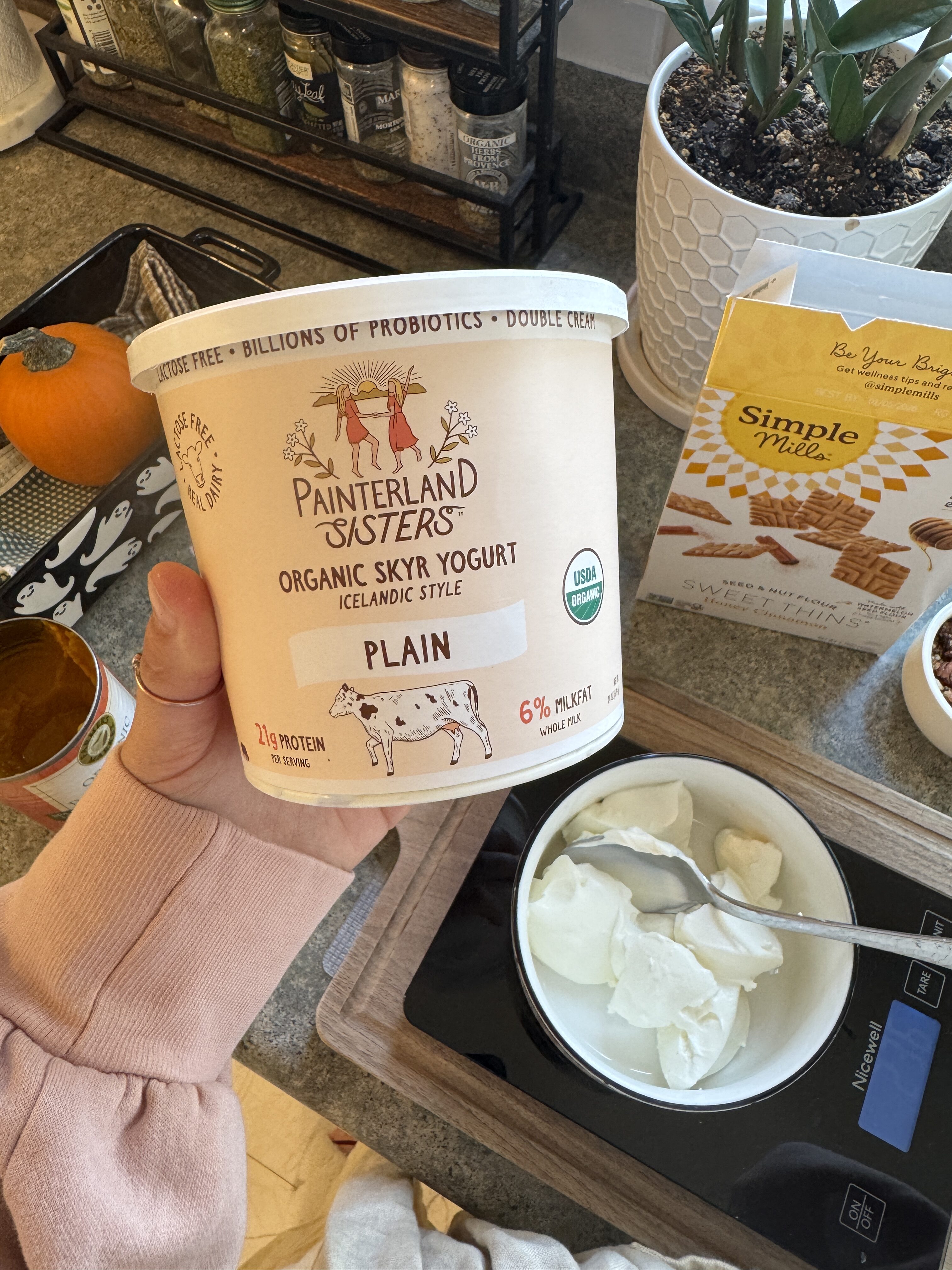 - Take 3/4 c of Greek yogurt, put into a bowl w/ 3 tbsp of canned pumpkin, 1/2 tbsp maple syrup, a sprinkle of cinnamon & pumpkin spice, mix until well combined. Add to a Ziploc bag, cut a small hole in one of the bottom corners of the bag. I use @painterlandsisters yogurt because it is the BEST flavor/texture I’ve ever had and it’s lactose free so it doesn’t hurt my stomach! If you’re a lactose intolerant person- I’d 10/10 recommend!