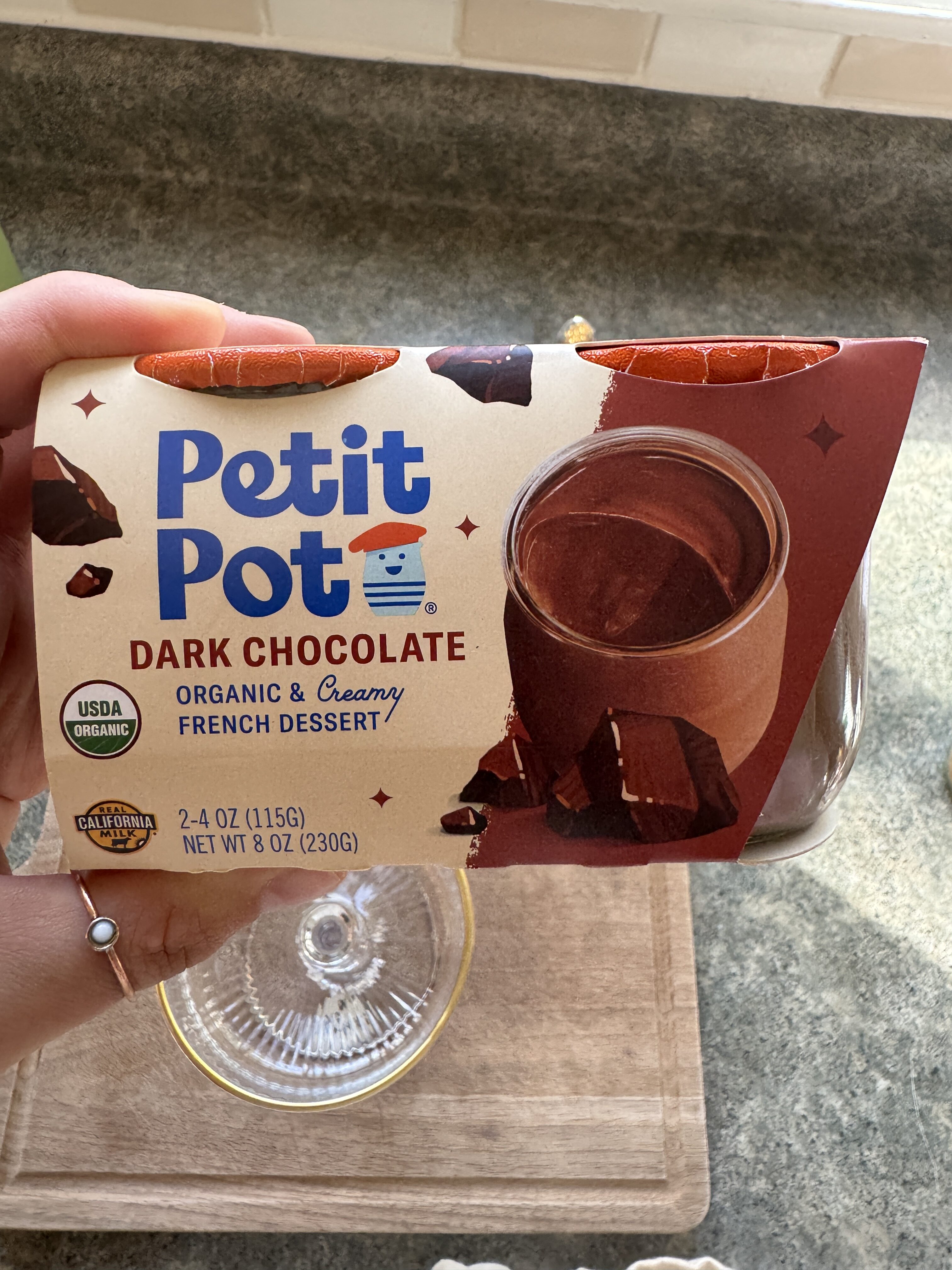 - You could use regular chocolate pudding (either one that’s already made, or a packet of pudding mix stirred and chilled), but I used a @petit_pot Dark Chocolate Flavor because it is the BEST type of chocolate pudding like dessert I’ve found. So creamy, very clean ingredients and it’s single serve! I split this one Petit Pot cup among 2 parfait glasses. If you do make chocolate pudding with a package- I’d say about 1/4-1/3 cup is all you need for each serving of this recipe.