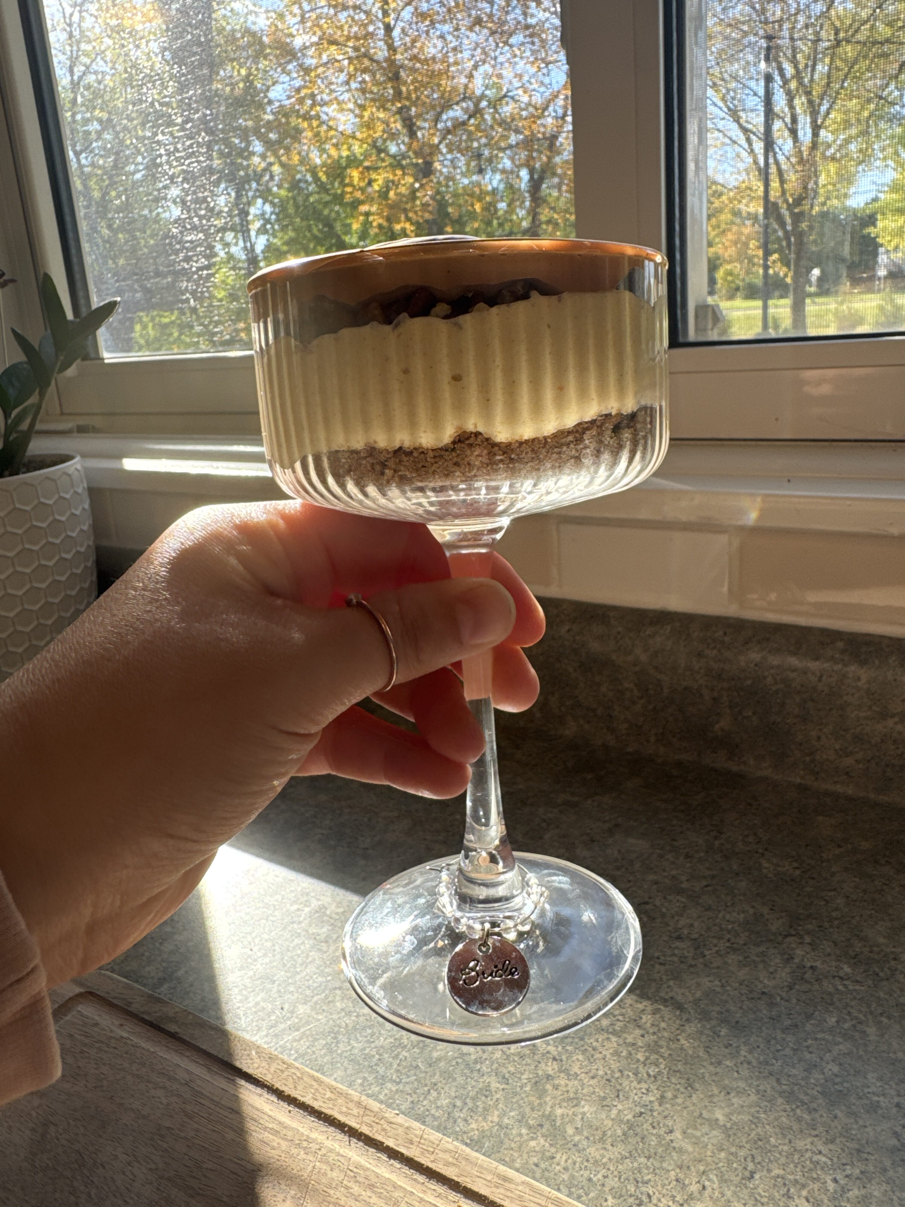 Why is this a healthier alternative? Every ingredient except the fudge on top has no preservatives, additives, or harmful oils. If I’m going to eat a dessert, I’d rather make *most* of it from scratch or use brands that I trust with straight forward ingredients, like the good ole days when we used real sugar, cream and eggs. Using date caramel adds about 7 grams of fiber (3.5 per serving) which is amazing for 1 dessert! The greek yogurt has a lot of protein in it, which is helpful in stabilizing blood sugar balance and keeping you fuller for longer. This parfait is indulgent but also adds a little healthy twist. Enjoy!