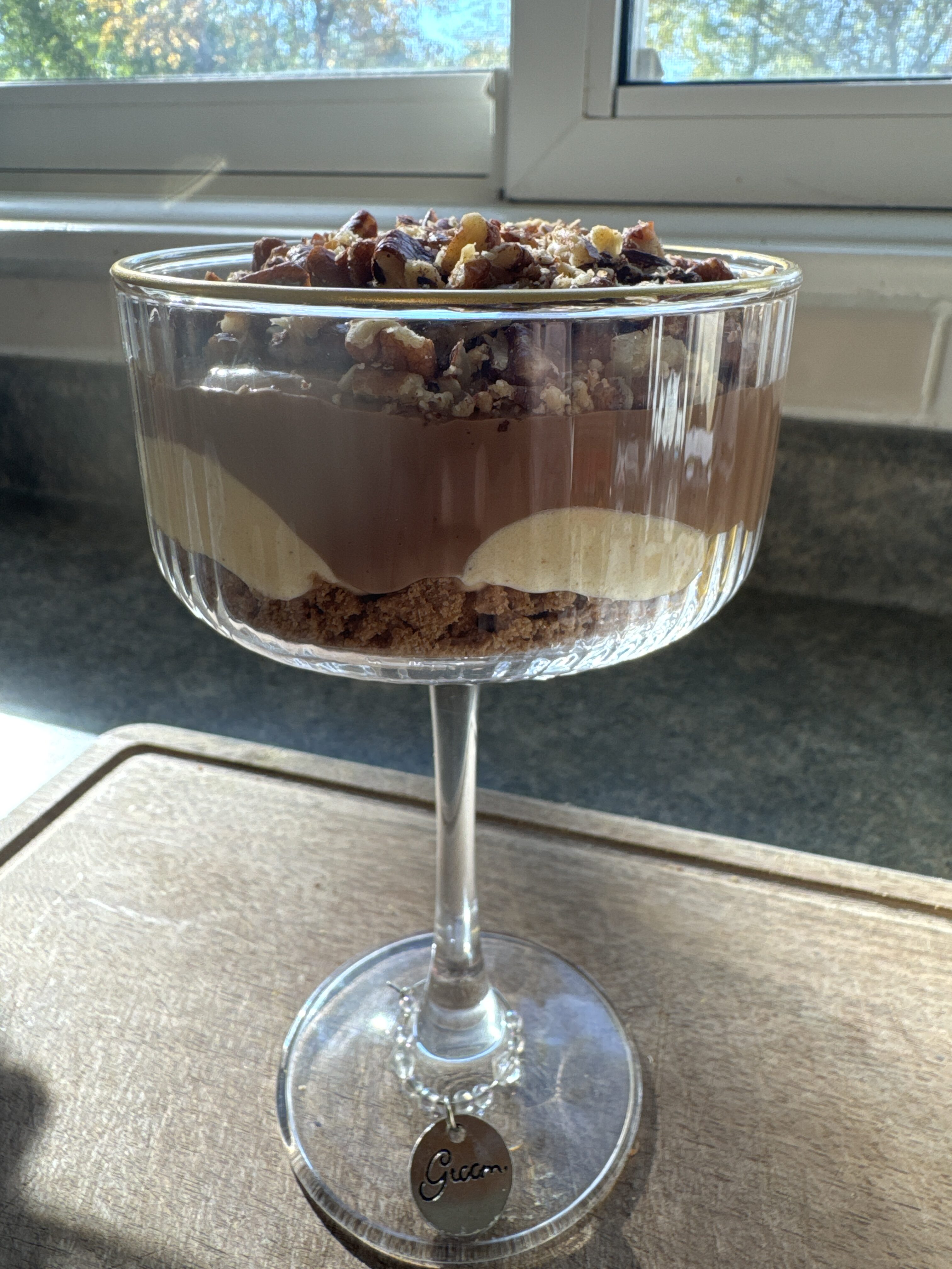 This dessert is luxurious, fluffy and so creamy!! Layered with a graham cracker crust, date caramel, roasted pecans, Chocolate Pot de Crème (like chocolate pudding but more of a French custard), whipped pumpkin Greek yogurt (tastes like pumpkin cheesecake), and topped with more pecans and fudge sauce! It is perfect for the holidays or an excuse to indulge.