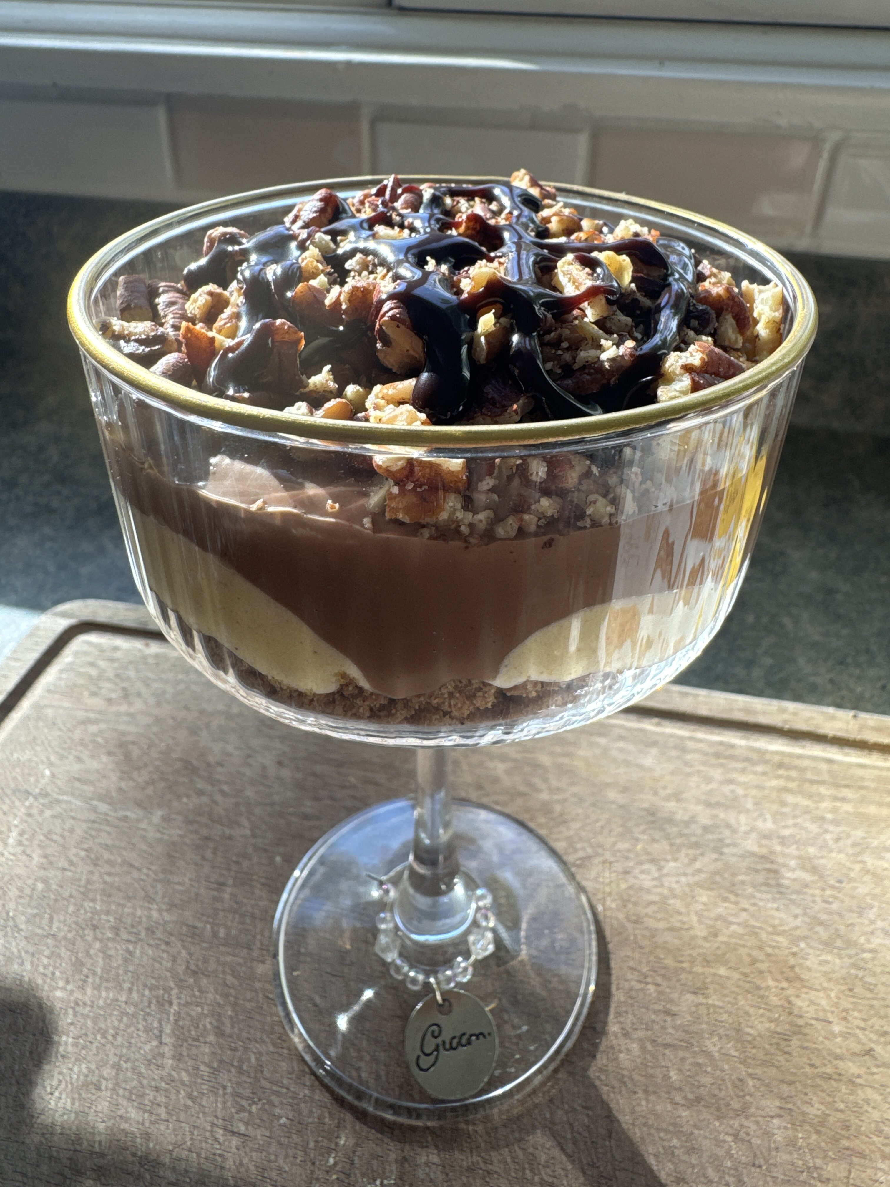- Now comes the fun part! The very top layer of your parfait can look however you’d like! I topped mine with a few more roasted pecans and a drizzle of hot fudge sauce to give it that elevated look (picture at top of page), but I did my husband’s with more pecans because he likes the extra crunch. Get creative and ENJOY! 🙂