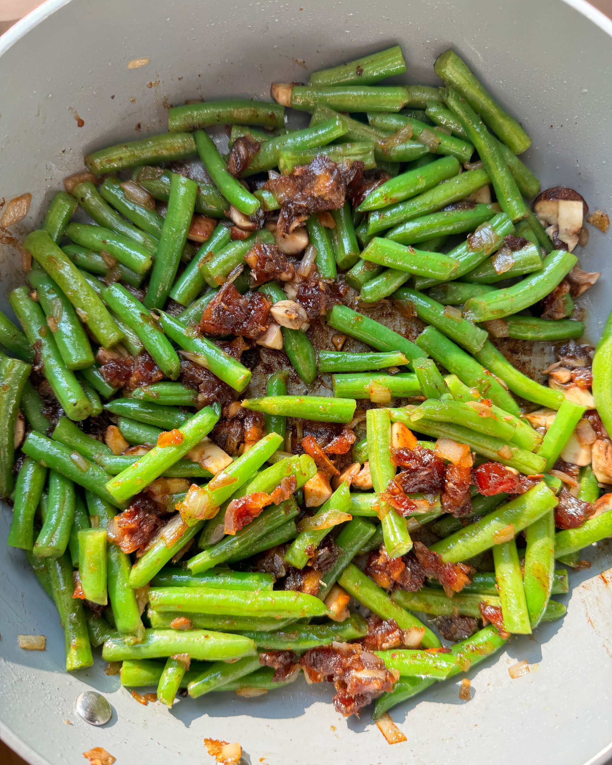 5. Place lid on the pan and cook green beans on medium-low heat for 12-15 minutes, stirring occasionally until they become crisp-tender, adding more time if you like yours on the tender side. Once the beans are the texture you’d like, drizzle some maple syrup on top and give the beans one more stir. Make sure to scrape everything off of the bottom to incorporate any date/bacon pieces that got stuck to the pan.