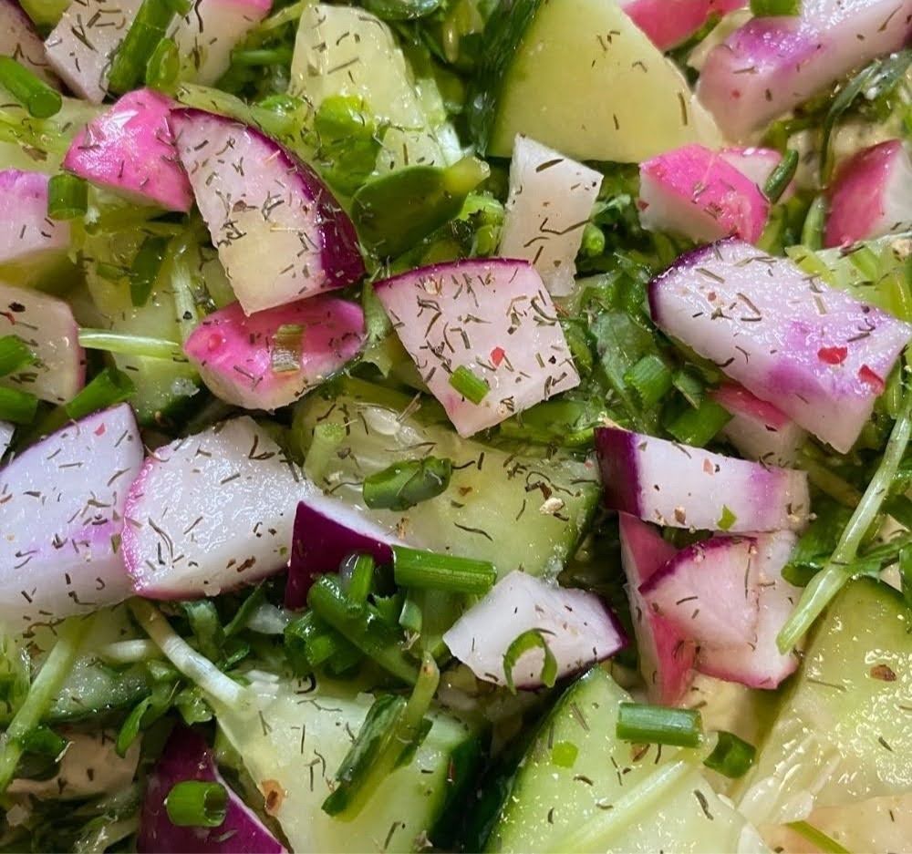 3. Next, sprinkle on top cumber, radish, dill and parsley (enough to cover everything, about 1 tsp each), chives, salt and pepper to taste, lemon juice, and a drizzle of olive oil.