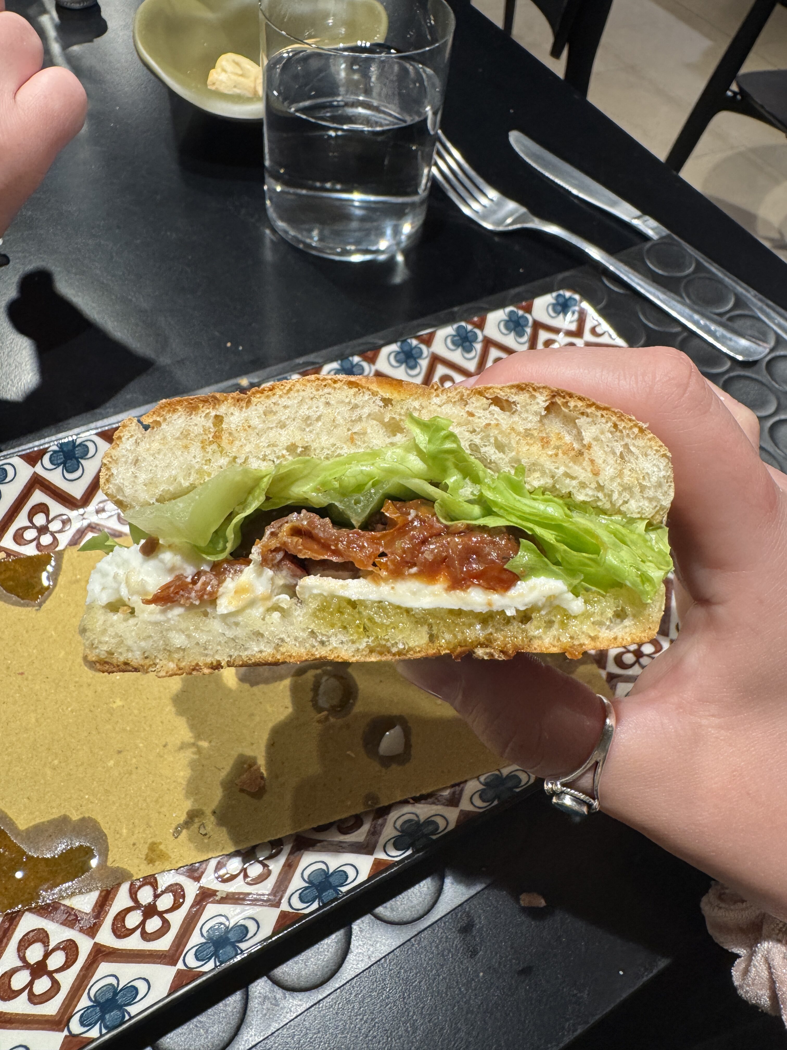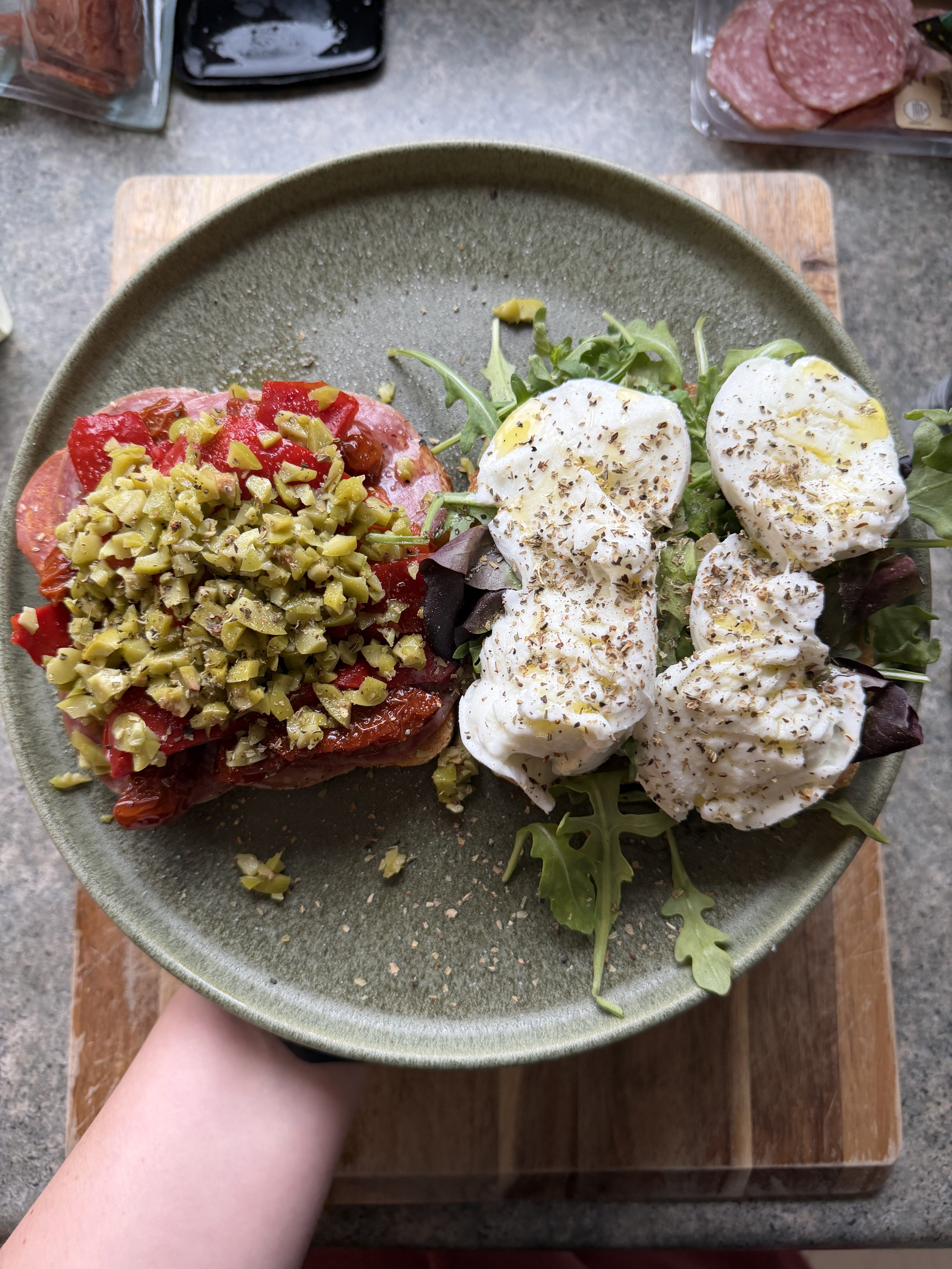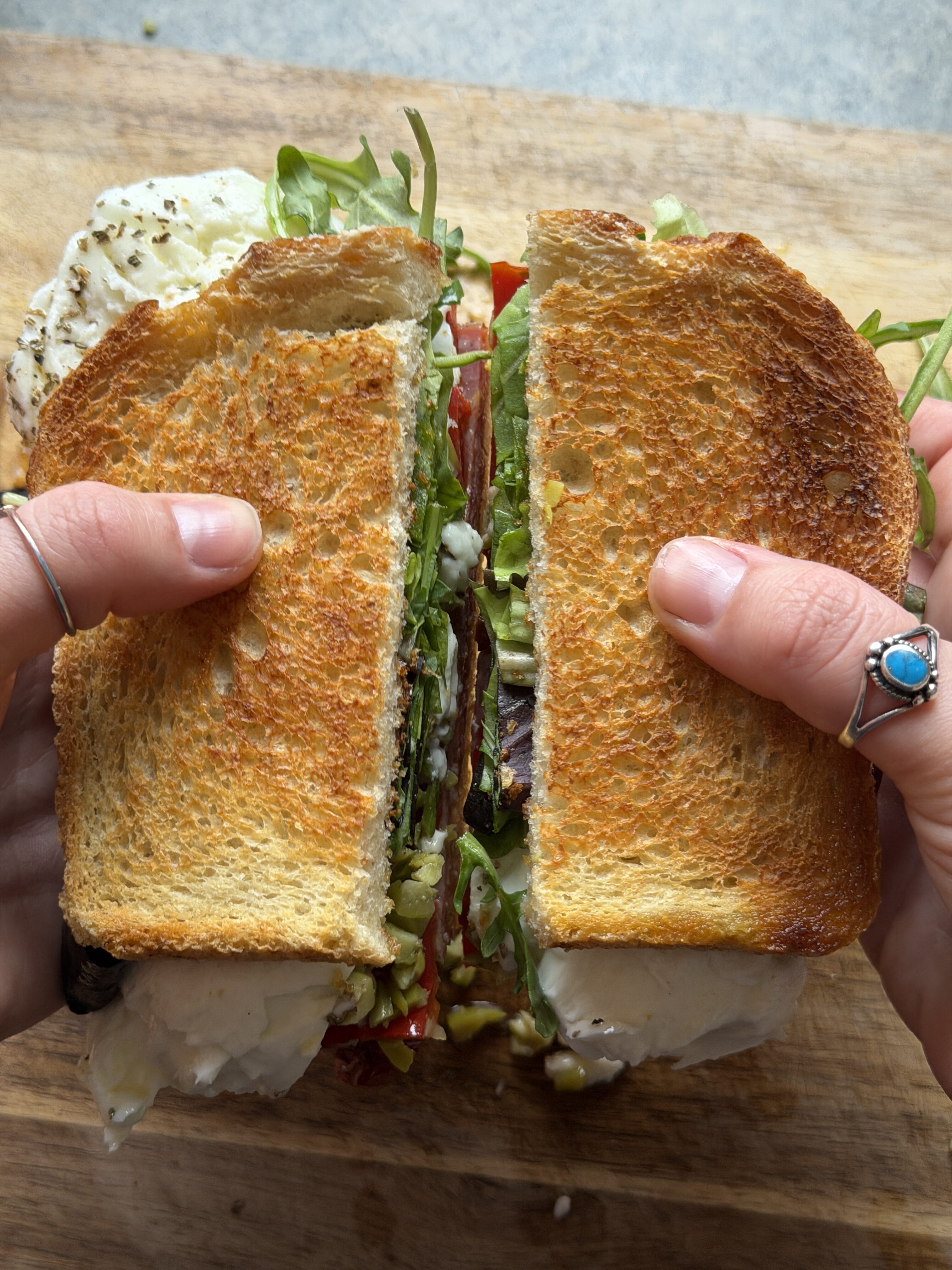 - Make sure to drizzle some juice from either the green olive jar or sun-dried tomato jar onto both slices of bread- it should be acidic (so containing vinegar), this gives everything a nice zest.